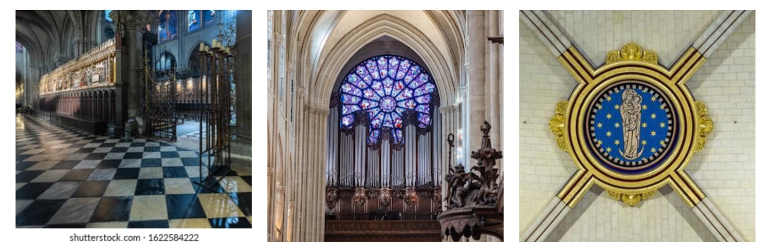 For example, upon entering, one can see a black and white checkered floor pattern, associated with freemasons (Ramzy,2024; Coughlin, 2024). France24 has also proved the resemblance of this white and black checkered floor with masonic symbol (France24, 2024). The cathedral also features a starry blue vault ceiling, which resembles a common architectural element found in masonic lodges, symbolizing the omnipresence of masonic lodge. Within this vault, there is a prominent image of the Virgin Mary standing upon a halfmoon - a symbol that scholars have linked to ancient moon goddess worship and the Babylonian queen Semiramis, who was also known as the "Queen of Heaven." (Rise, 2024)