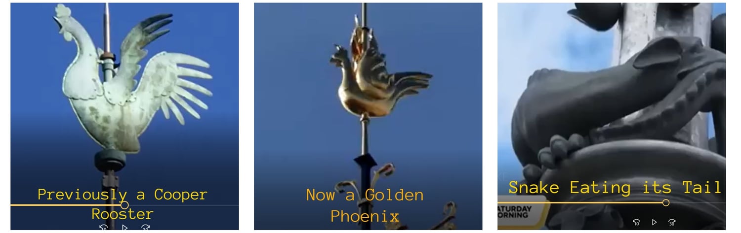 A glance at the cathedral building reveals changes to its iconic spire. The originally spire featured a copper rooster weathervane, a traditional symbol of France. During the restoration, this was replaced with a new golden rooster resembling a phoenix—an occult symbol used in esoteric and masonic traditions to represent spiritual transformation and rebirth through fire—complete with flame-like wings. Adding to this concern is the presence of an ouroboros symbol (a symbol of a dragon or serpent eating its own tail) to the Notre Dame cathedral's design! (Bitchute, 2024).