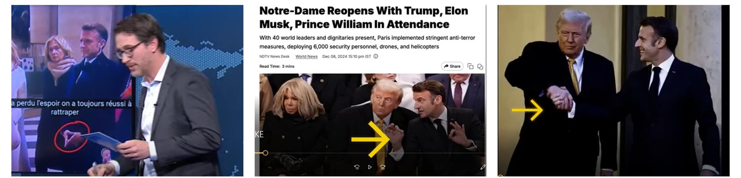 Another notable aspect was President Macron's visit to the cathedral before its official reopening, where the French president [deliberately] made an inverted Masonic pyramid symbol with his fingertips, Alerting the Illuminati Masons! Later, during the opening ceremony on December 7, 2024, mainstream media photographs (see for example, this NDTV photo) showed Macron seated next to Donald Trump making what some observers described as a "666" hand gesture. How convenient could this be? As noted by a commenter in this video, the Notre Dame cathedral's reopening occurred exactly 28,666 days after Donald Trump's birth (June 14, 1946 - December 7, 2024). "Notre Dame's ceremonial reopening also marks Trump's return to the world stage" (PBS News, 2024). It's notable that while the current U.S. president was absent, Trump attended and met with President Macron.
